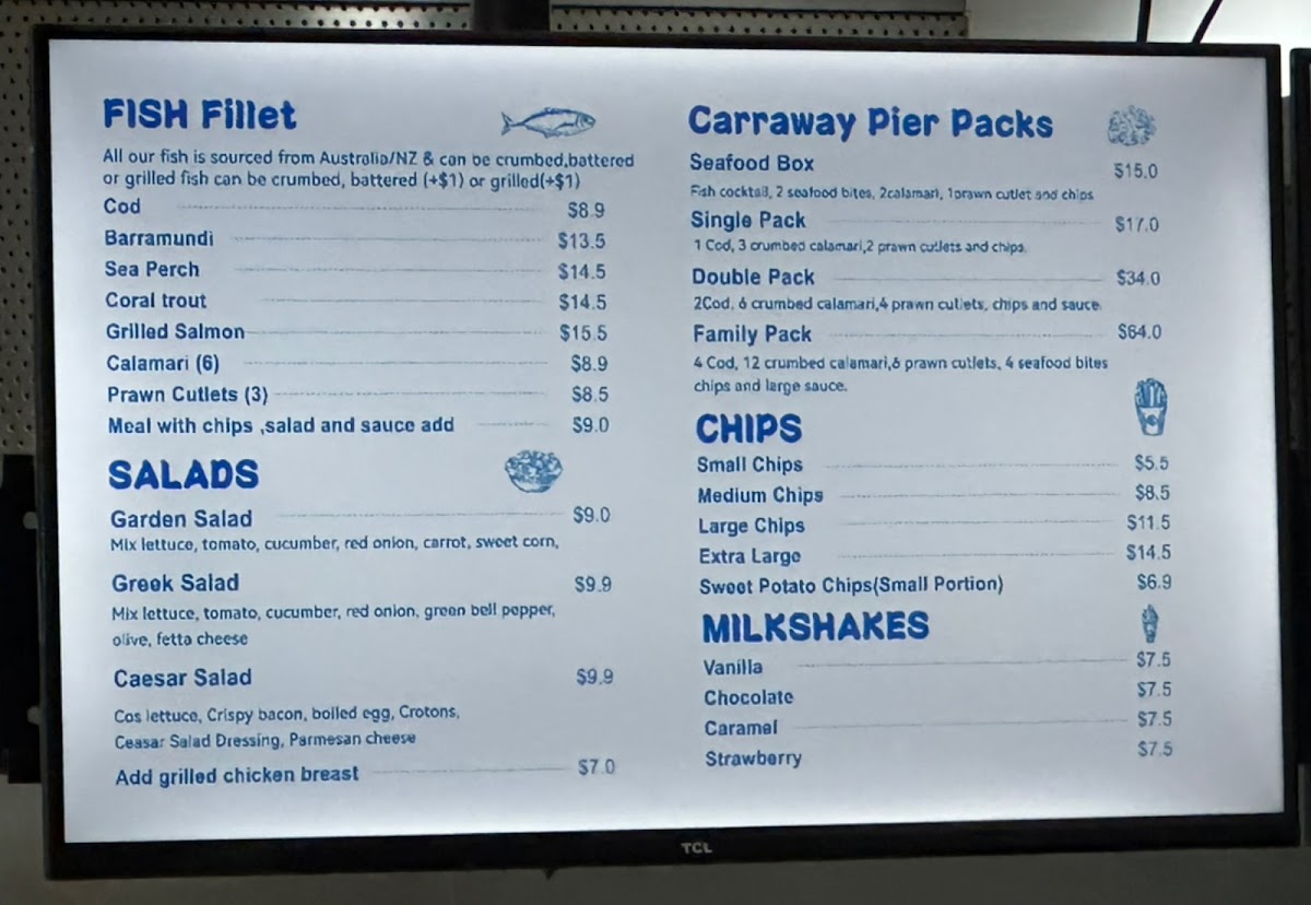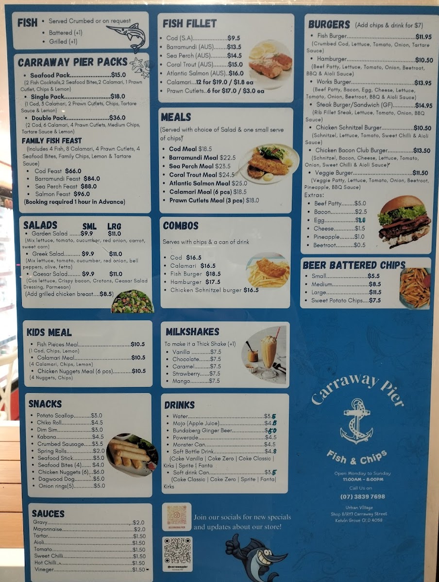 Introducing the menu at Carraway Pier, a hidden gem nestled in the village center of Kelvin Grove, Australia, this place is a testament to the art of fish and chips. Patrons rave about the crunchy, medium-fried chips boasting a soft center, with one customer deeming them the best fries ever. The star attraction here is undoubtedly the sea perch battered fish, celebrated for its tenderness and freshness. The generous portions have captured the hearts of many, making it a go-to fast-food destination.
